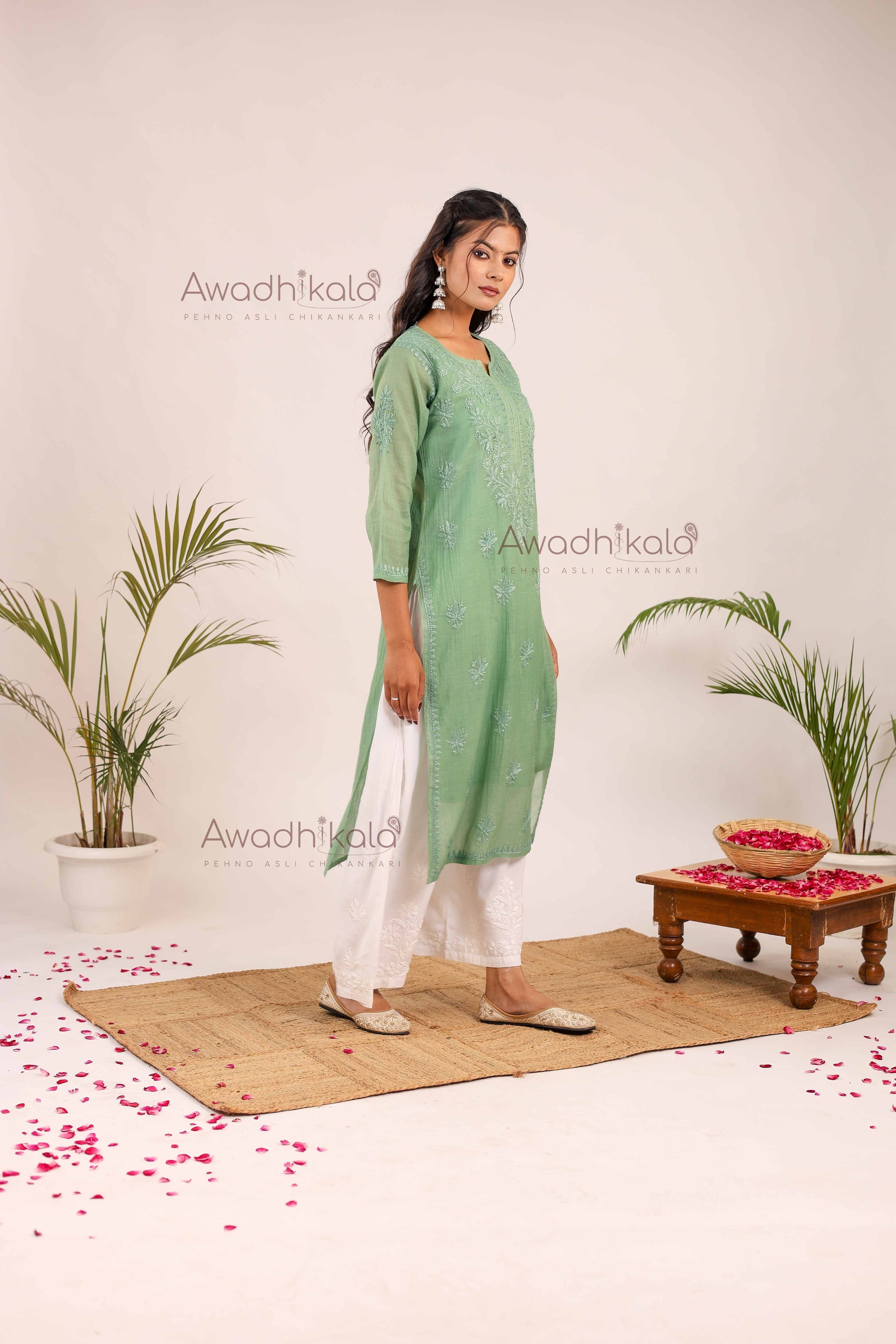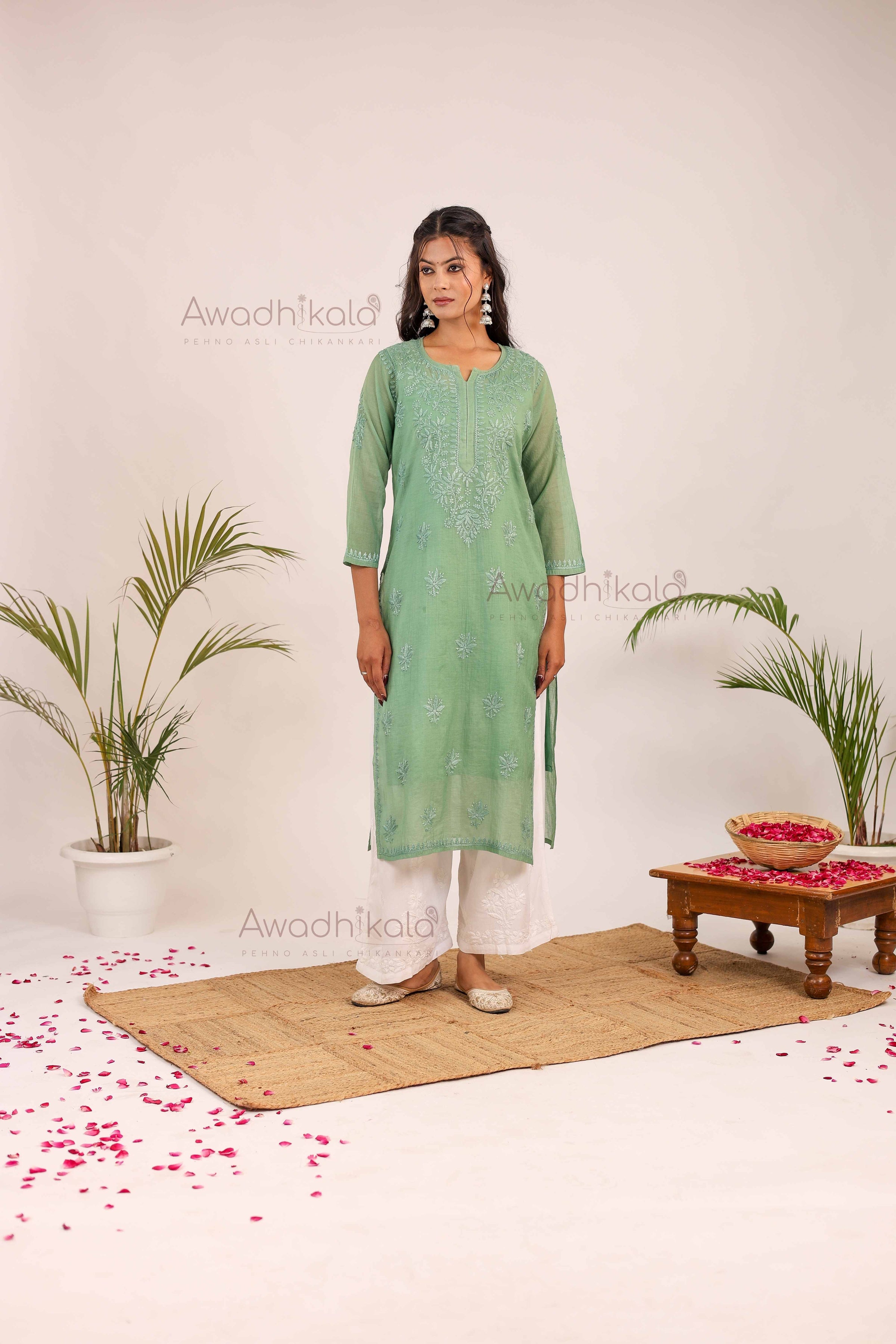 Introducing Trisha — a fresh green kurti that adds a touch of nature-inspired calm to your wardrobe. Crafted from breathable Mulchanderi cotton, it features elegant Ghas Patti hand embroidery that makes every detail feel thoughtful and timeless. A summer-friendly essential, it’s perfect for everyday wear, work looks, or laid-back festive dressing.